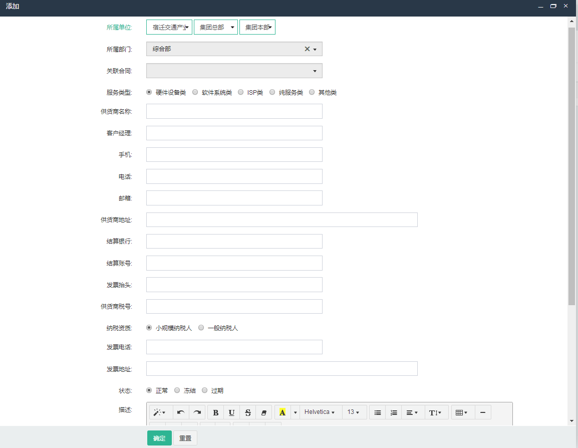 系统提供了对供应商的基础管理模块供使用。点击供应商模块,将显示目前已经登记的供应商列表。 当需要增加供应商时,点击页面中的“添加”按钮,在弹出的添加页面按提示添加相应信息后,点击“确定”按钮即可保存。文档更新时间: 2022-01-20 18:52 作者:王刚