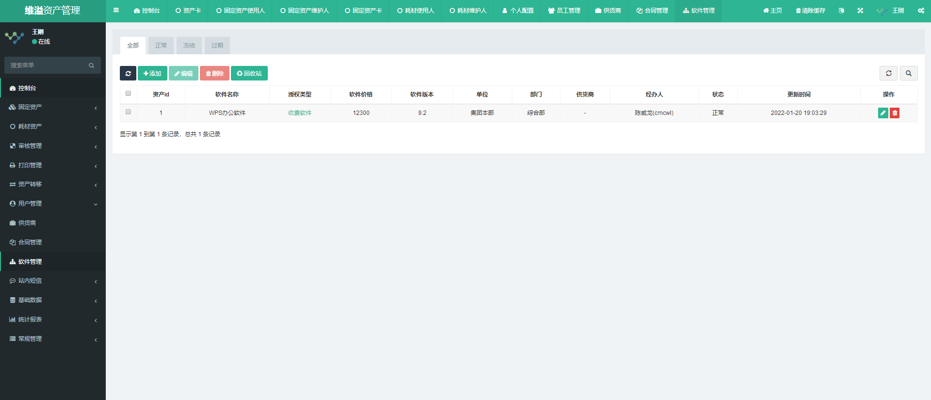 目录 搜索 固定资产管理系统操作手册第一章 引言第二章 系统概述第三章 运行环境第四章 使用说明登录主页功能区功能模块固定资产资产入库信息录入资产分配资产管理资产检索查看详情资产评价资料变更维修申请资产调拨打印条码报废申请资产日志盘点日志盘点计划资产日志低值易耗品低值易耗品入库低值易耗品管理审核管理打印管理条码打印管理卡资产转移用户管理个人配置员工管理供应商管理合同管理软件管理站内短信基础数据计量单位审核流程流程步骤资产分类资产单位资产部门存放位置统计报表 暂无相关搜索结果! 本文档使用 MinDoc 发布 软件管理 如需通过系统对集团采购的软件进行登记和管理,可通过软件管理模块进行操作。 当需要添加新的记录时,点击页面“添加”按钮,将弹出添加页面。按页面要求进行输入即可。 注:其中的供应商、合同两项下拉框与前述供应商、合同管理已进行关联。文档更新时间: 2022-01-20 19:05 作者:王刚