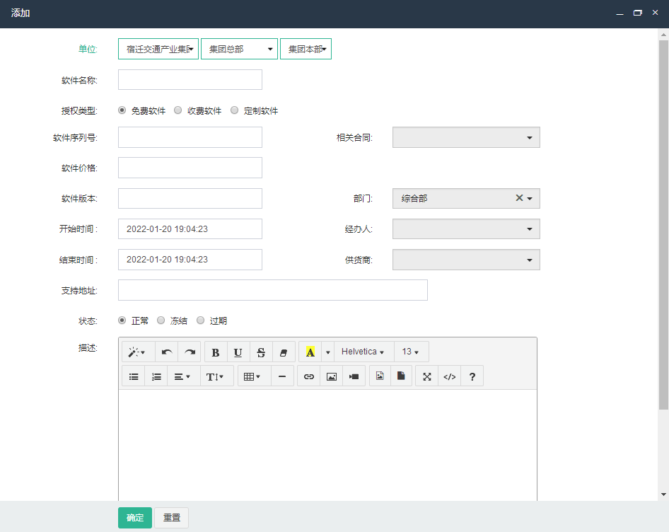 如需通过系统对集团采购的软件进行登记和管理,可通过软件管理模块进行操作。 当需要添加新的记录时,点击页面“添加”按钮,将弹出添加页面。按页面要求进行输入即可。 注:其中的供应商、合同两项下拉框与前述供应商、合同管理已进行关联。文档更新时间: 2022-01-20 19:05 作者:王刚