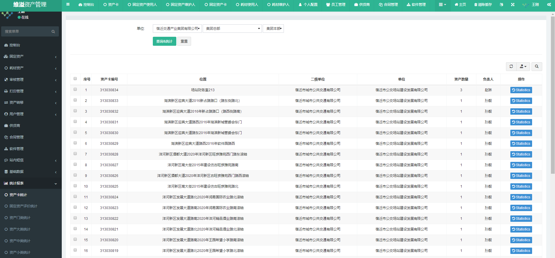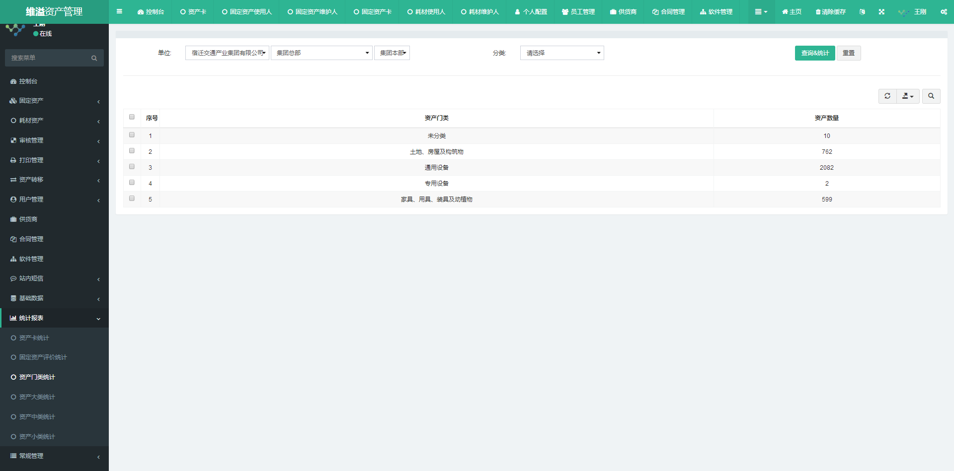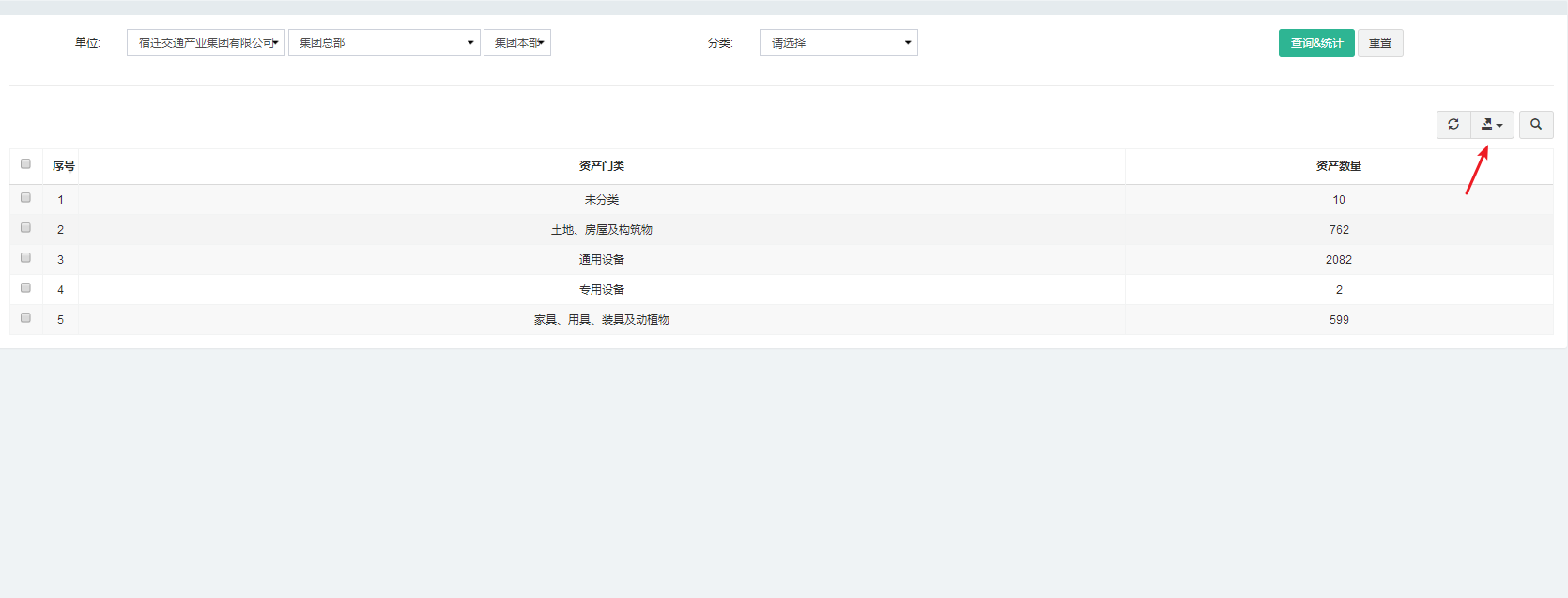 资产管理的主要数据通过统计报表模块进行统一输出。需要查看报表时,点击统计报表模块对应的报表名称菜单。如资产卡统计 注:当资产卡内资产存在调拨等引起资产卡有变化时,先点击对应资产卡后的“Statistics”按钮进行刷新。 资产门类统计 注:当需要对统计的报表进行导出时,点击页面右上方导出按钮,可导出Excel或Csv格式。文档更新时间: 2022-01-20 19:43 作者:王刚