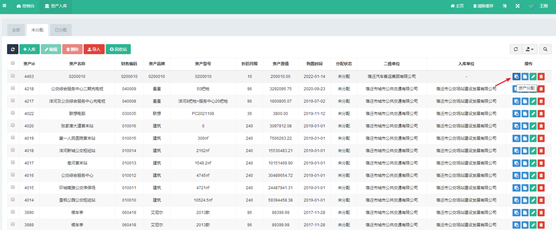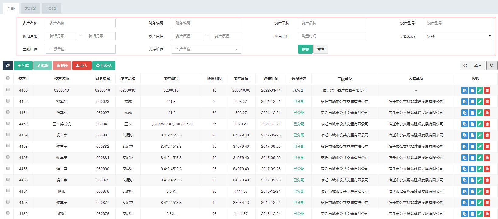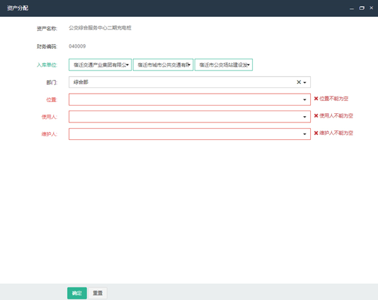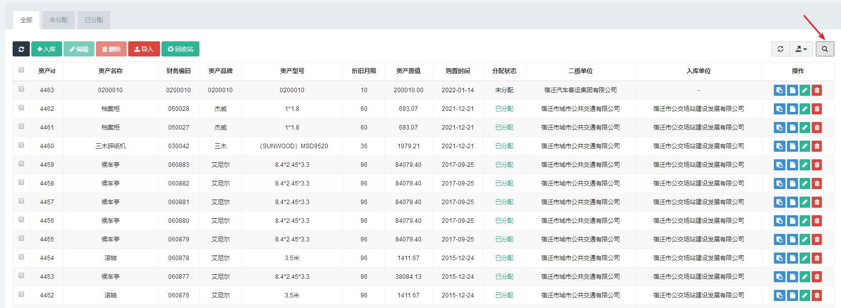 在完成资产信息录入后,将进行资产分配操作。具体步骤为:在资产入库Tab页的待分配资产列表中,选择需进行分配的资产列表后的第一个按钮。 在弹出的资产分配页面选择资产所属部门、所在位置、使用人、维护人等信息。点击确定即可完成资产分配。 点击确定即可完成资产分配。 待分配资产页面支持检索功能。点击待分配资产右上方检索按钮。 在对应的检索条件框中输入检索条件即可完成检索。 文档更新时间: 2022-01-20 12:09 作者:王刚