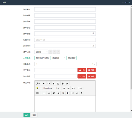 点击“入库”按钮,按弹出的页面所要求的字段从财务提供的卡片中得到对应数据,逐一填入。资产图片及资产相册由相机或智能手机拍摄后获取。 全部录入后,点击“确定”按钮完成资产信息录入。 注:在资产信息录入后,未分配前,资产基础信息可任意修改。文档更新时间: 2022-01-20 12:15 作者:王刚