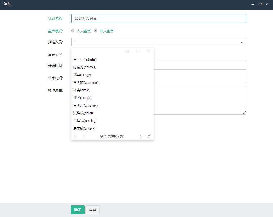 根据实际情况,进行固定资产盘点计划的新建工作。盘点模式分为:人人盘点和专人盘点两种,其中人人盘点指所有人员均可进行盘点并拥有数据上传的权限。专人盘点则为开展专项盘点或指定盘点小组进行盘点时使用,需在新建盘点计划时指定人员。