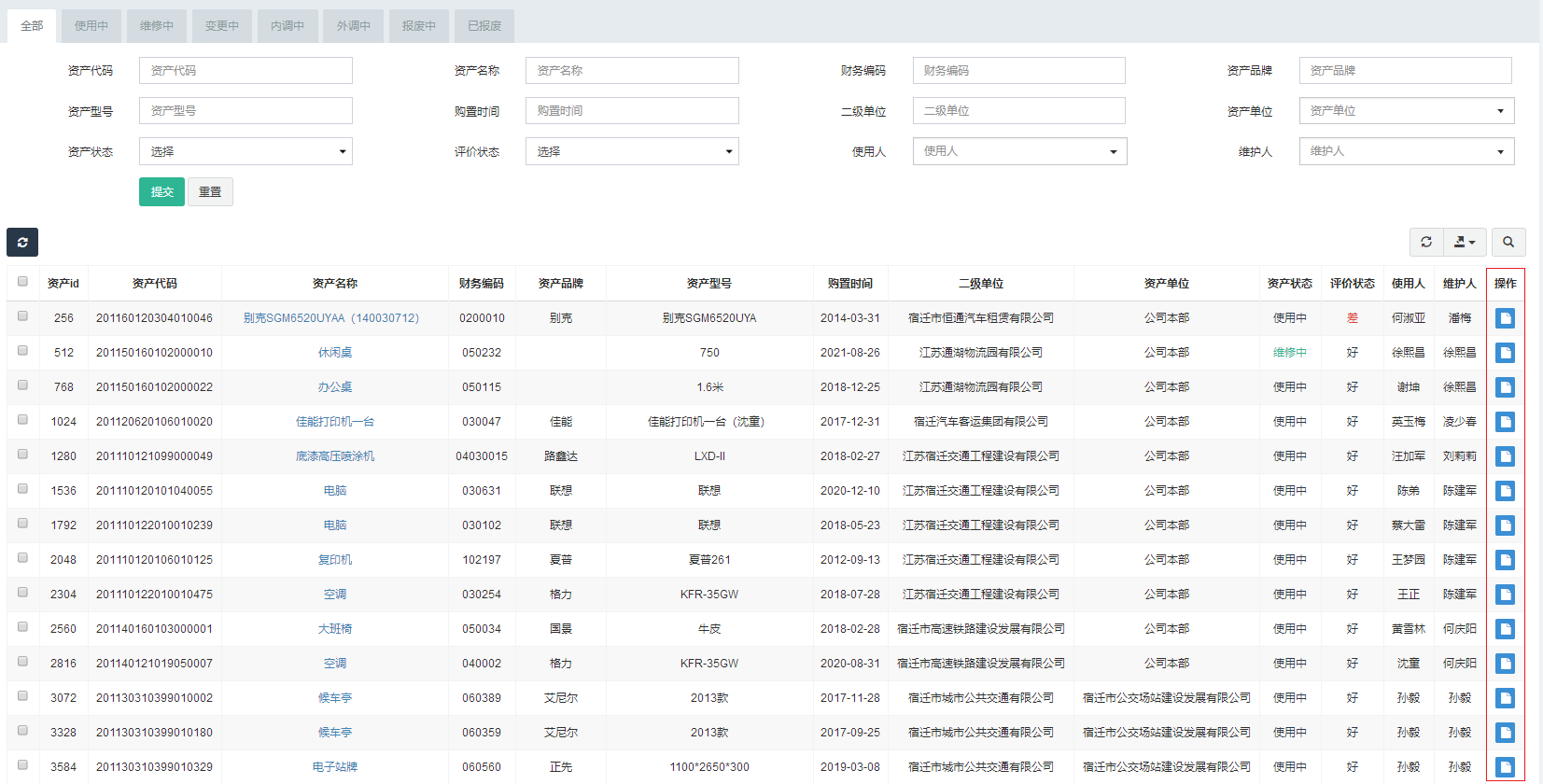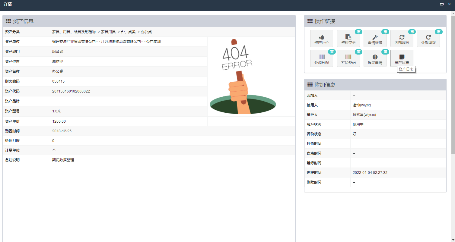 目录 搜索 固定资产管理系统操作手册第一章 引言第二章 系统概述第三章 运行环境第四章 使用说明登录主页功能区功能模块固定资产资产入库信息录入资产分配资产管理资产检索查看详情资产评价资料变更维修申请资产调拨打印条码报废申请资产日志盘点日志盘点计划资产日志低值易耗品低值易耗品入库低值易耗品管理审核管理打印管理条码打印管理卡资产转移用户管理个人配置员工管理供应商管理合同管理软件管理站内短信基础数据计量单位审核流程流程步骤资产分类资产单位资产部门存放位置统计报表 暂无相关搜索结果! 本文档使用 MinDoc 发布 查看详情 如需查看资产详情,请在资产列表页面后方操作列点击查看详情按钮,即可查看对应行资产详情。 文档更新时间: 2022-01-20 22:21 作者:王刚