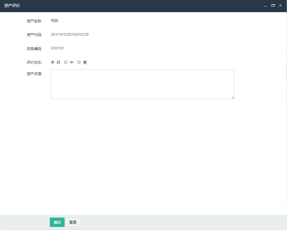 按集团《固定资产管理办法》相关规定,应定期对固定资产现状进行如实评价,具体操作步骤为:点击资产详情页右侧操作区内的“资产评价”按钮 将弹出资产评价页面按资产实际现状进行评价即可。注:中、差评需通过资产评语进行 描述。文档更新时间: 2022-01-20 12:34 作者:王刚
