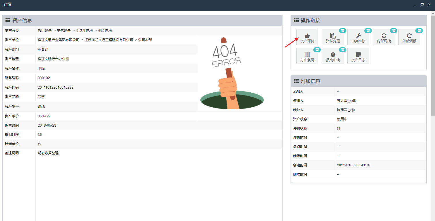 目录 搜索 固定资产管理系统操作手册第一章 引言第二章 系统概述第三章 运行环境第四章 使用说明登录主页功能区功能模块固定资产资产入库信息录入资产分配资产管理资产检索查看详情资产评价资料变更维修申请资产调拨打印条码报废申请资产日志盘点日志盘点计划资产日志低值易耗品低值易耗品入库低值易耗品管理审核管理打印管理条码打印管理卡资产转移用户管理个人配置员工管理供应商管理合同管理软件管理站内短信基础数据计量单位审核流程流程步骤资产分类资产单位资产部门存放位置统计报表 暂无相关搜索结果! 本文档使用 MinDoc 发布 资产评价 按集团《固定资产管理办法》相关规定,应定期对固定资产现状进行如实评价,具体操作步骤为:点击资产详情页右侧操作区内的“资产评价”按钮 将弹出资产评价页面按资产实际现状进行评价即可。注:中、差评需通过资产评语进行 描述。文档更新时间: 2022-01-20 12:34 作者:王刚