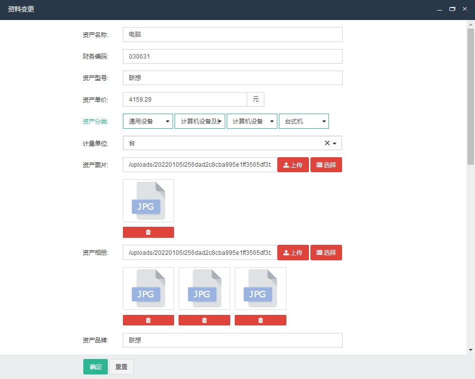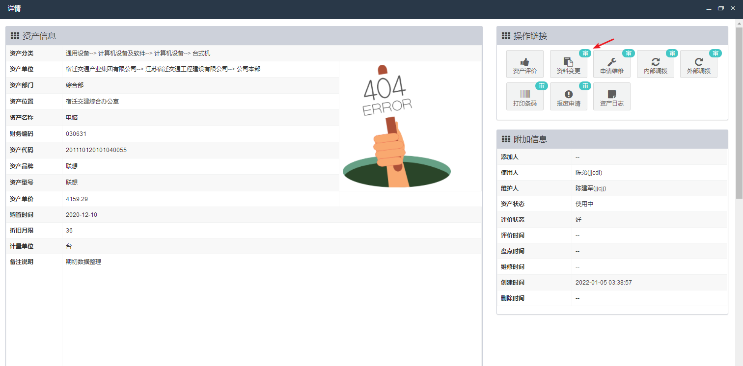 当发生资产信息录入错误且已分配时,将无法直接变更,此时需在需要变更的资产详情页右侧操作区,点击资料变更按钮。 点击后,将弹出资料变更页面。按需变更的实际情况,变更对应项后,点击“确定”按钮即可提交变更审核。由具有审核权限的人员进行批准后,完成资料变更。 文档更新时间: 2022-01-20 12:51 作者:王刚