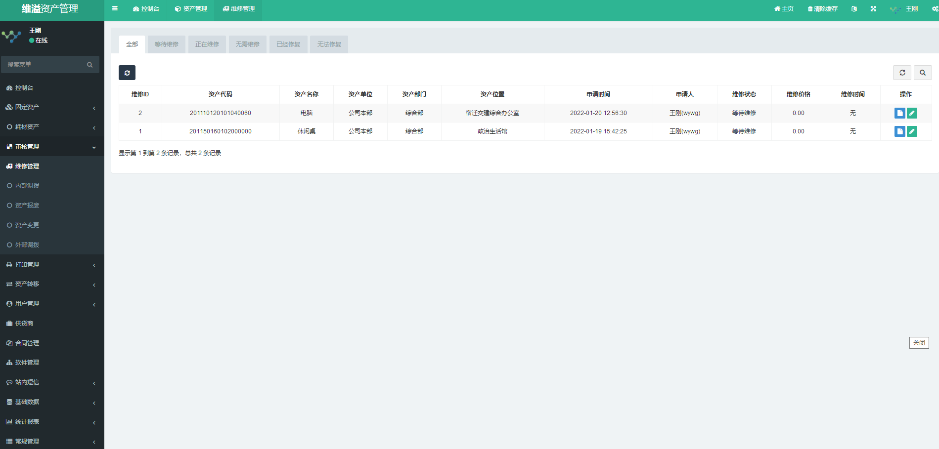 此时由资产维护人点击“审核管理”模块的“维修管理”功能,列表将显示所有已提交维修的资产列表。