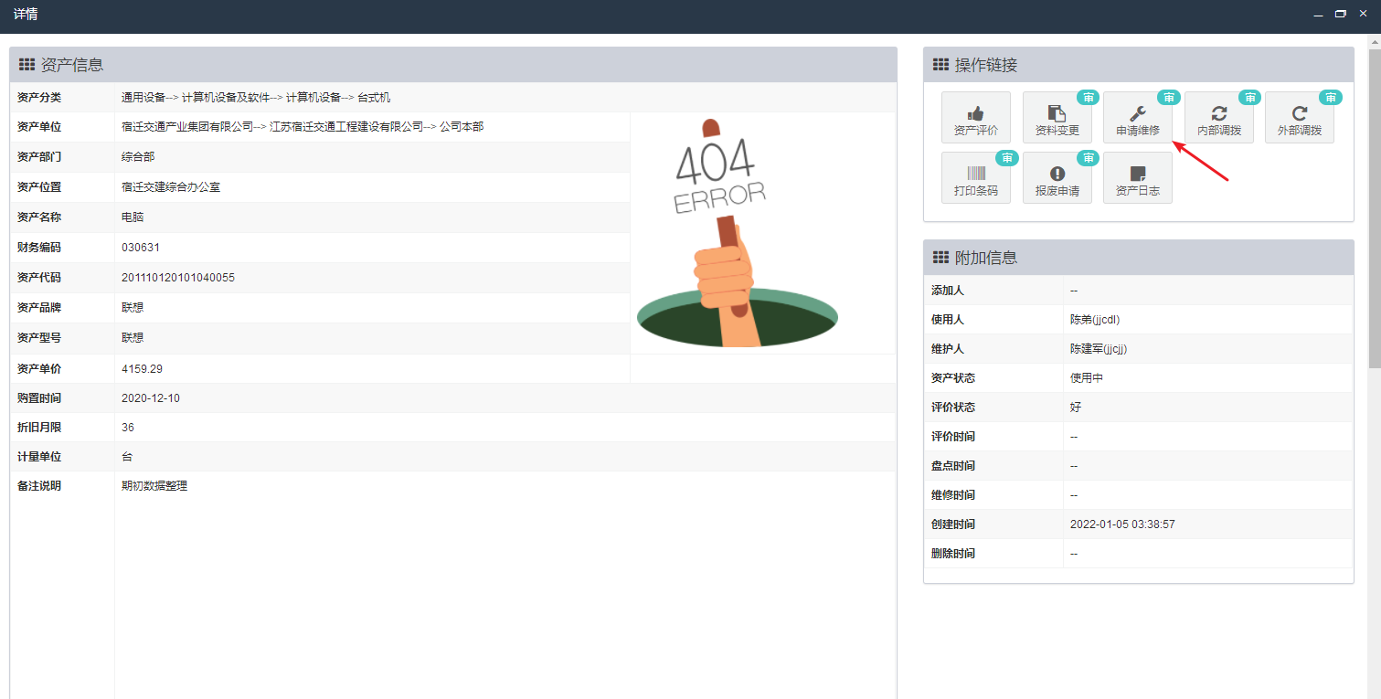 资产的良好使用(运行)状态离不开定期定期保养和发生故障后的及时维修。当发生需要维护维修的情况时,在资产详情右侧操作区点击“申请维修”按钮。