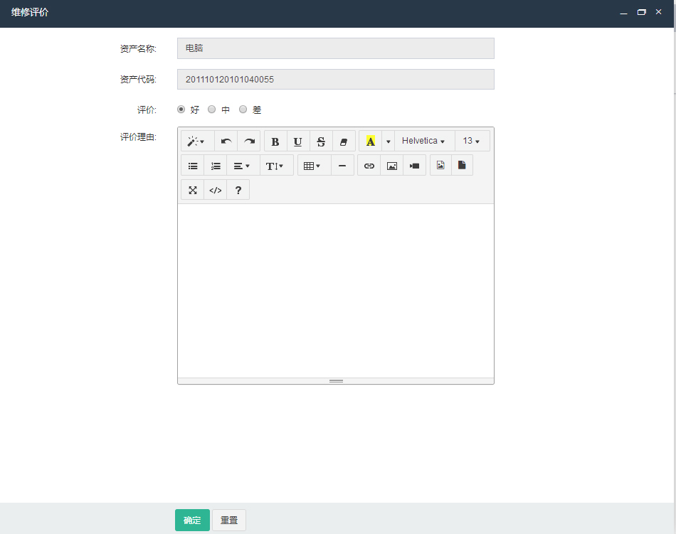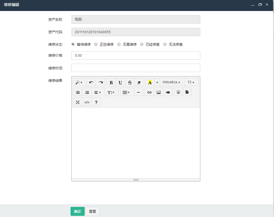 点击“维修编辑”按钮,弹出维修情况编辑界面,根据资产实际维修后的情况输入,点击确定按钮即可。