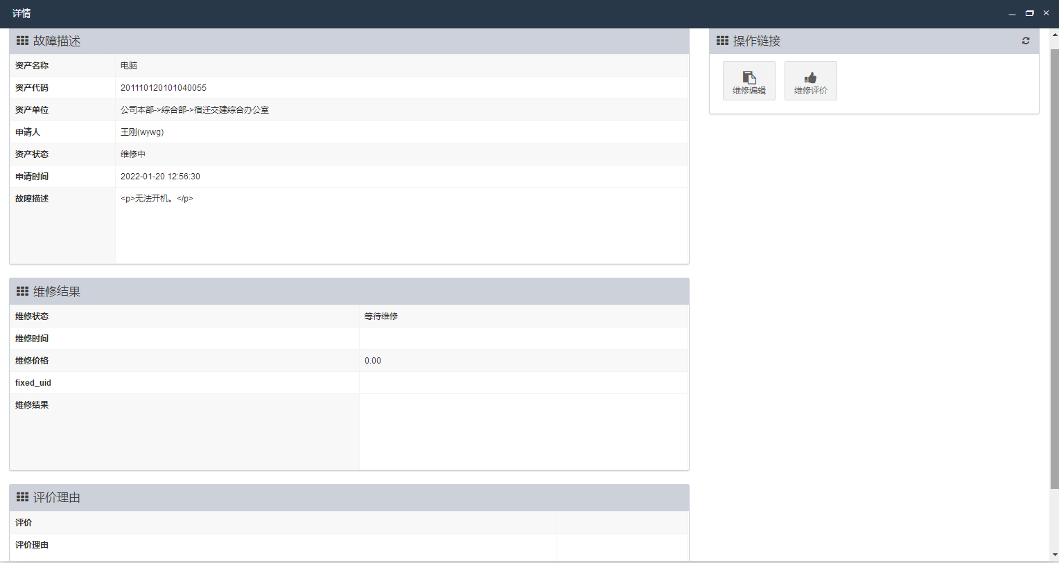 同时,对于维修后的资产需要进行一次“资产评价”,以真实反应维修后的资产实际状态,在详情页面点击“维修评价”,进行资产状态的实际评价即可。
