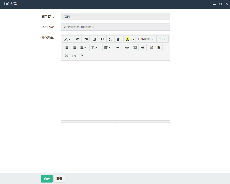 弹出打印条码窗口,输入打印该条码的理由后,点击“确定”按钮,该条打印申请将提交至具有条码打印权限的相关人员处,进行统一打印。