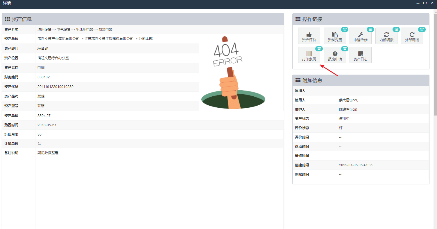 当新增(更新)资产后,系统将自动提交该资产的条码打印申请。当资产在日常使用过程中,发生条码磨损、丢失等情况影响管理时,可在系统内资产详情页面右侧操作区,点击“打印条码”按钮。