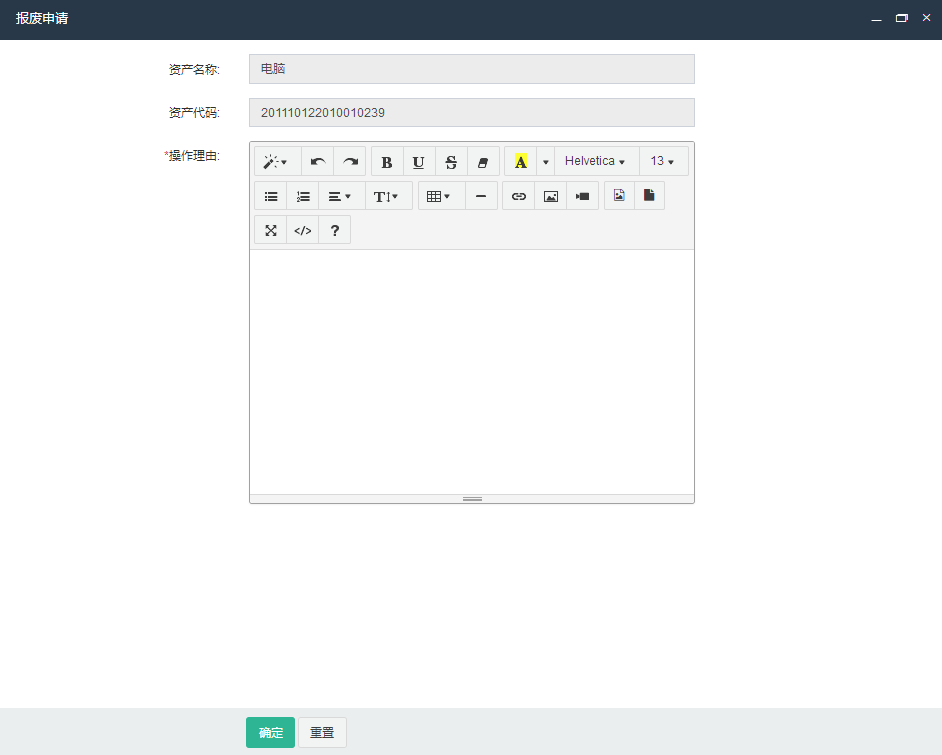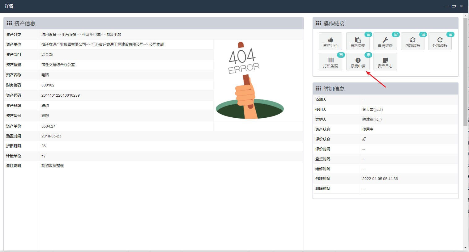 当资产状况较差,经过多次维修仍无法继续使用或无维修价值经集团有关部门同意,并按集团《固定资产管理办法》有关规定,经集团专项会议审批通过后,由单位资产管理员在系统中进行资产报废流程。具体步骤为:点击资产详情页右侧操作区,点击内“报废申请”按钮。在弹出报废页面,按资产的实际情况,在操作理由中输入相关理由后点击确定。即可完成报废申请。提交申请后,按集团固定资产报废审核意见,逐级审核后通过。文档更新时间: 2022-01-20 14:37 作者:王刚
