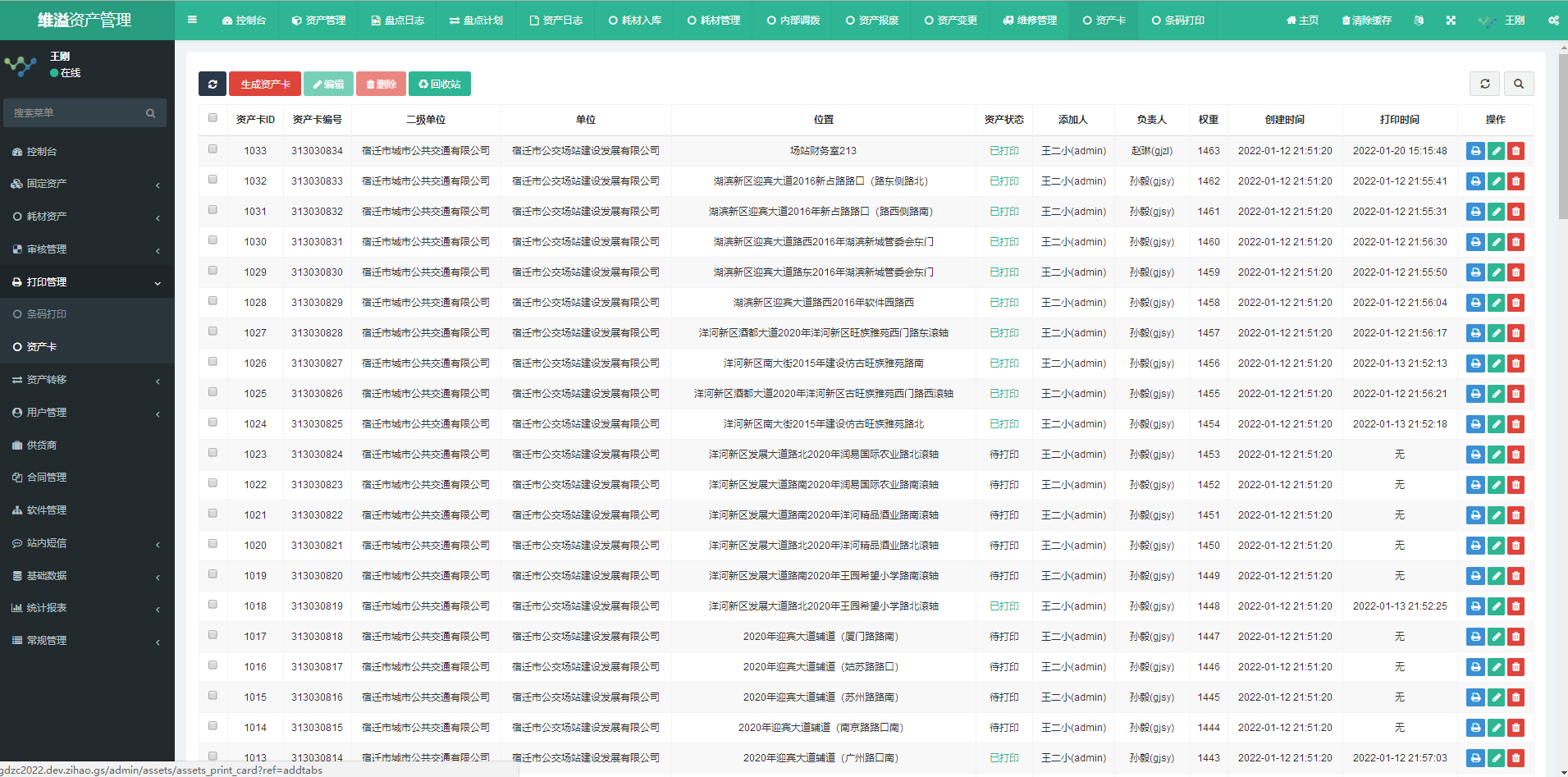 资产管理卡为各点位固定资产基本信息汇总,点击选择某一条数据后的打印按钮即可通过条码打印机输出该点位管理卡的二维码。注:当新增资产点位后,需点击“生成管理卡”按钮,进行资产管理卡的重新生成。文档更新时间: 2022-01-20 15:34 作者:王刚