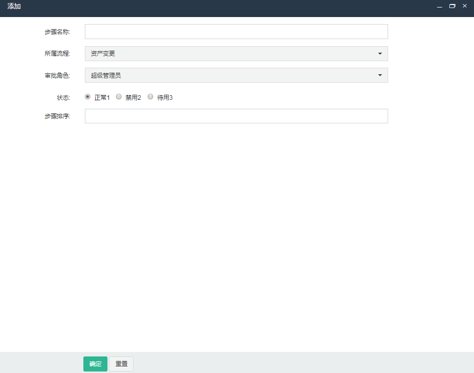 根据职能部门在固定资产管理中具有一定的审核权限,通过基础数据管理模块的流程步骤可以对审核流程的步骤进行灵活配置。 如需添加流程步骤,可点击页面“添加”按钮后,选择需要配置的审核流程模型,选择审核组进行配置。 注:审核流程根据添加的记录和排序进行环节流转。文档更新时间: 2022-01-20 19:49 作者:王刚