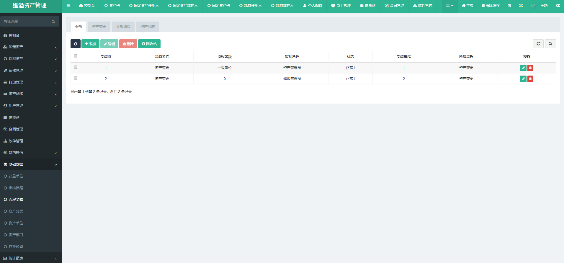 目录 搜索 固定资产管理系统操作手册第一章 引言第二章 系统概述第三章 运行环境第四章 使用说明登录主页功能区功能模块固定资产资产入库信息录入资产分配资产管理资产检索查看详情资产评价资料变更维修申请资产调拨打印条码报废申请资产日志盘点日志盘点计划资产日志低值易耗品低值易耗品入库低值易耗品管理审核管理打印管理条码打印管理卡资产转移用户管理个人配置员工管理供应商管理合同管理软件管理站内短信基础数据计量单位审核流程流程步骤资产分类资产单位资产部门存放位置统计报表 暂无相关搜索结果! 本文档使用 MinDoc 发布 流程步骤 根据职能部门在固定资产管理中具有一定的审核权限,通过基础数据管理模块的流程步骤可以对审核流程的步骤进行灵活配置。 如需添加流程步骤,可点击页面“添加”按钮后,选择需要配置的审核流程模型,选择审核组进行配置。 注:审核流程根据添加的记录和排序进行环节流转。文档更新时间: 2022-01-20 19:49 作者:王刚