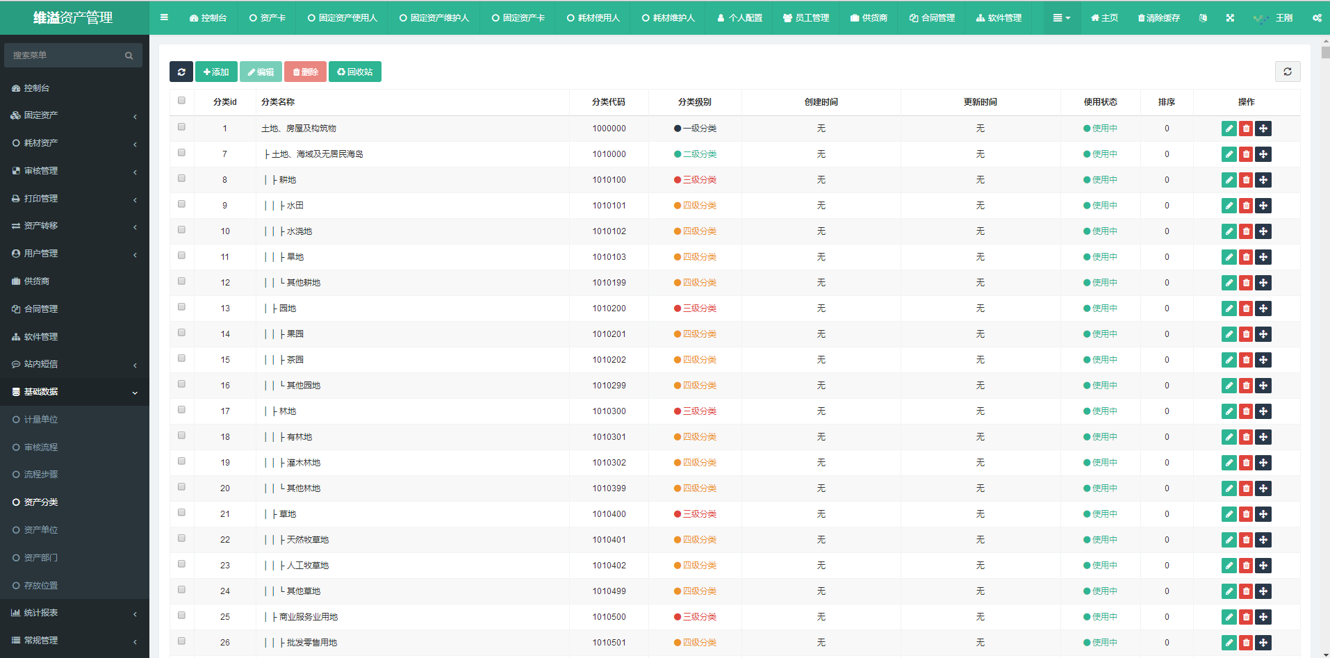 目录 搜索 固定资产管理系统操作手册第一章 引言第二章 系统概述第三章 运行环境第四章 使用说明登录主页功能区功能模块固定资产资产入库信息录入资产分配资产管理资产检索查看详情资产评价资料变更维修申请资产调拨打印条码报废申请资产日志盘点日志盘点计划资产日志低值易耗品低值易耗品入库低值易耗品管理审核管理打印管理条码打印管理卡资产转移用户管理个人配置员工管理供应商管理合同管理软件管理站内短信基础数据计量单位审核流程流程步骤资产分类资产单位资产部门存放位置统计报表 暂无相关搜索结果! 本文档使用 MinDoc 发布 资产分类 系统内的资产分类是按照国标《固定资产分类与代码》——GB/T14885-2010进行统一设置。其中涵盖的固定资产分类较为齐全。如确需添加,点击“添加”按钮,确定需要添加的资产分类为几级。 注:资产分类是固定资产管理系统的核心支持项之一,涉及系统能否正常运行。如非必要,请勿调整和变更资产分类。文档更新时间: 2022-01-20 19:17 作者:王刚