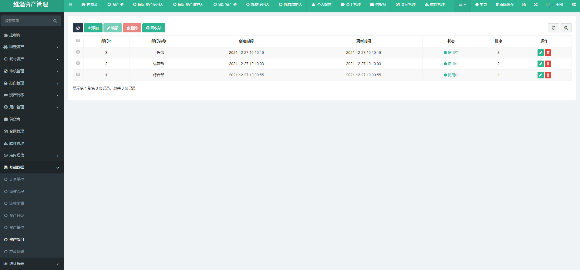目录 搜索 固定资产管理系统操作手册第一章 引言第二章 系统概述第三章 运行环境第四章 使用说明登录主页功能区功能模块固定资产资产入库信息录入资产分配资产管理资产检索查看详情资产评价资料变更维修申请资产调拨打印条码报废申请资产日志盘点日志盘点计划资产日志低值易耗品低值易耗品入库低值易耗品管理审核管理打印管理条码打印管理卡资产转移用户管理个人配置员工管理供应商管理合同管理软件管理站内短信基础数据计量单位审核流程流程步骤资产分类资产单位资产部门存放位置统计报表 暂无相关搜索结果! 本文档使用 MinDoc 发布 资产部门 系统允许添加和配置资产使用部门。如无部门强逻辑,默认为综合部。 如需添加资产部门,可点击页面“添加”按钮,按页面提示操作即可。文档更新时间: 2022-01-20 19:30 作者:王刚